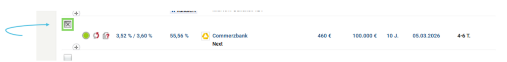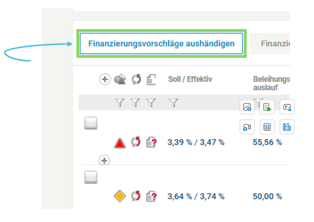Dafür klicke in der Ergebnisliste das Kreuzchen an, um die Bank auszuwählen und gehe oben auf “Finanzierungsvorschlag aushändigen”.