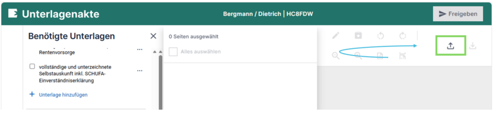 Du kannst die Unterlagen direkt in der Akte über das markiertes Symbol hochladen: