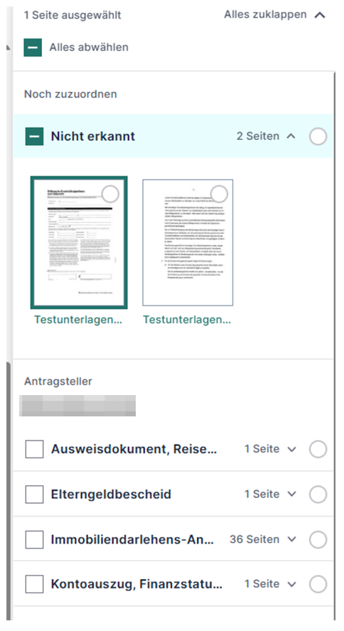 Die Unterlagenakte sortiert die Unterlagen dann selbst in die richtige Kategorie ein. Hierbei kann es aber vorkommen, dass Unterlagen auch falsch zugeordnet werden. Daher sollte man die zugeordneten Unterlagen nochmal überprüfen.