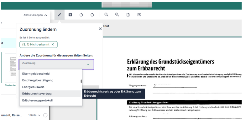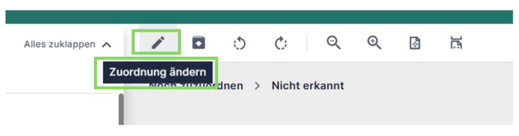 Es gibt auch Unterlagen, die die KI nicht zuordnen kann. Diese sind dann ganz oben im Reiter “Nicht erkannt”. Diese musst du dann noch manuell zuordnen. Genauso kannst du auch alle anderen Unterlagen zuordnen und in andere Kategorien verschieben.