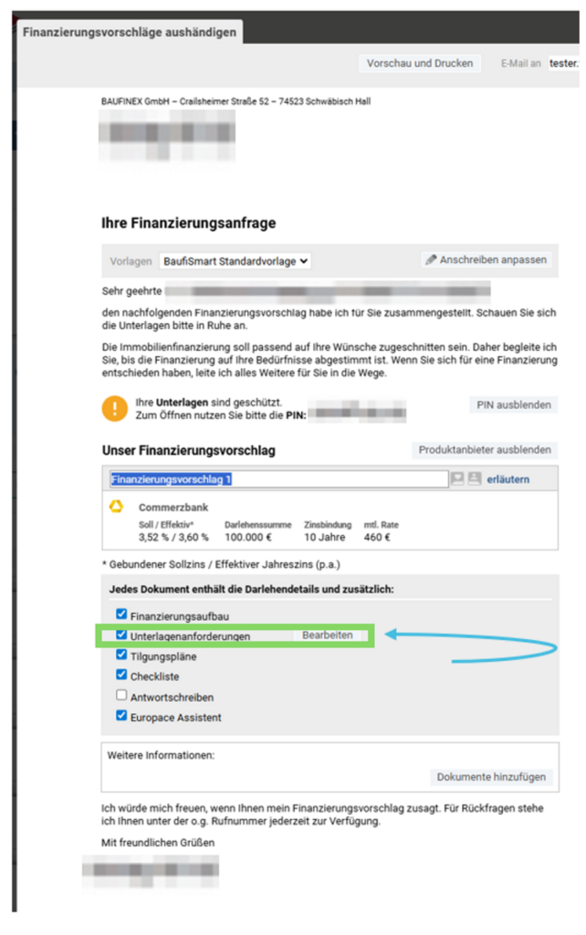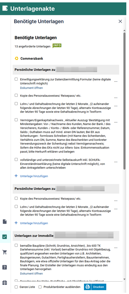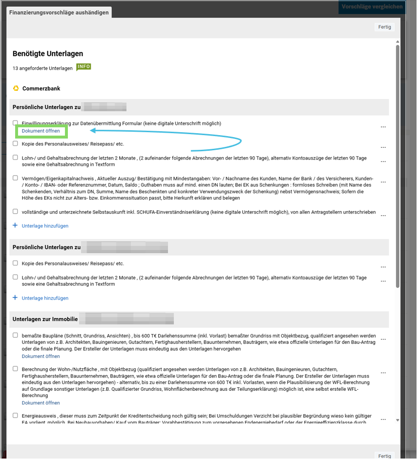 Du kannst die Unterlagenliste der jeweiligen Bank direkt an deinen Kunden senden und selbst einsehen.