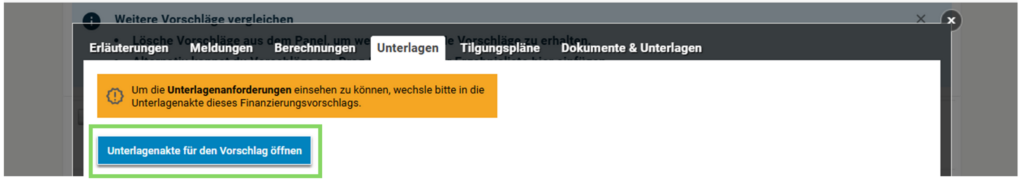 Anschließend gehst du auf den Reiter “Unterlagen” und klickst “Unterlagenakte für den Vorschlag öffnen” an.